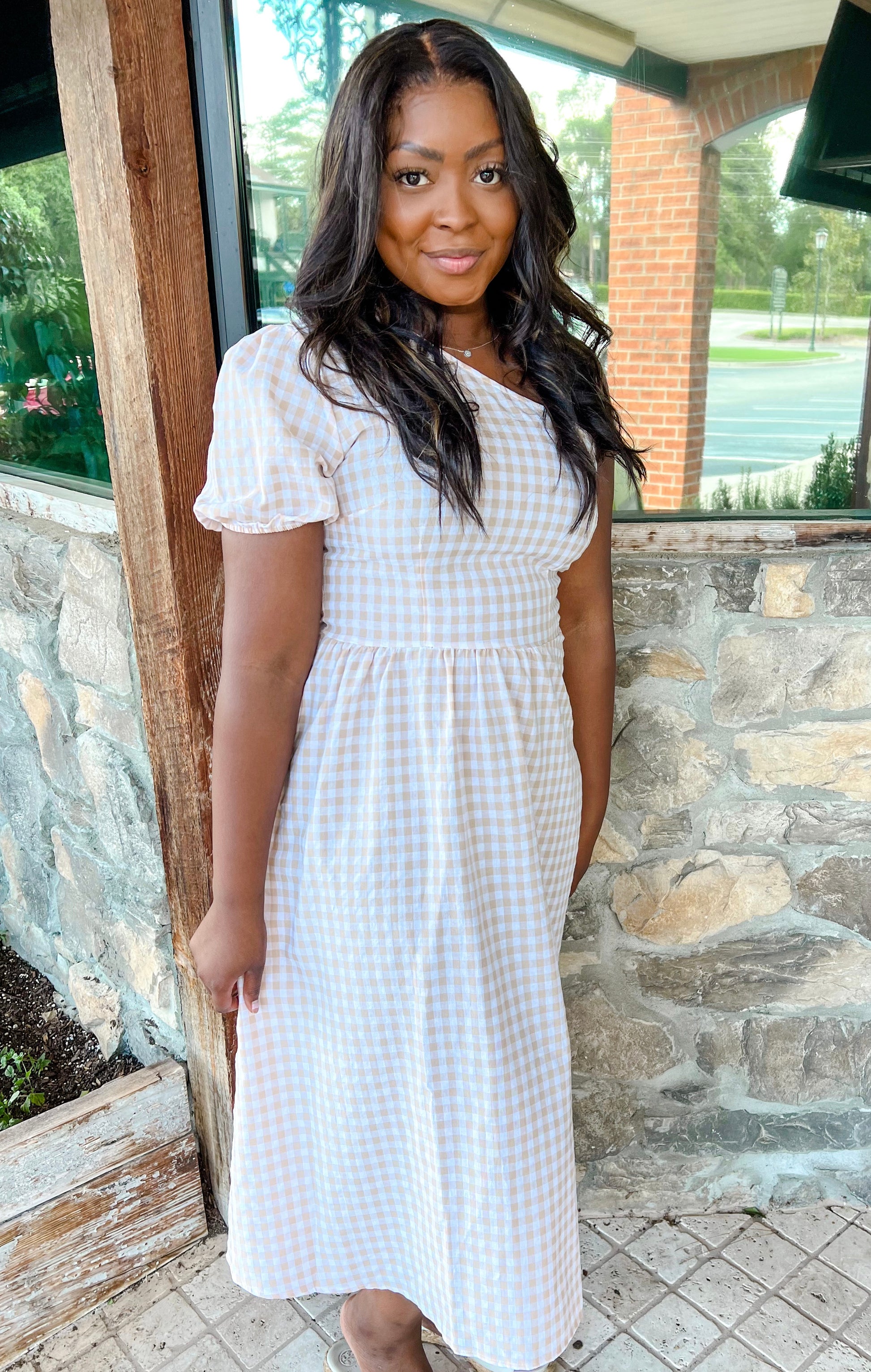 Traditional meets trendy with this Gingham midi dress. The one shoulder elastic puff sleeve offers the ultimate elevation!